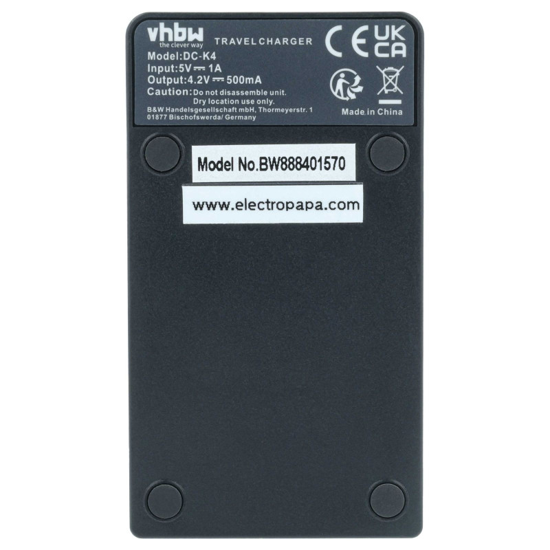 Izredno praktična polnilna postaja VHBW za polnjenje baterij za fotoaparate/kamere, ki deluje preko priključka MicroUSB. Polnilno postajo z USB kablom povežemo na vsak napajalnik za mobilni telefon oz. tablični računalnik, ki deluje prek priključka MicroUSB. Vsebuje LED statusni indikator, ki nam kaže stanje polnjenja baterije. Priložen je tudi USB kabel dolžine 40 cm.