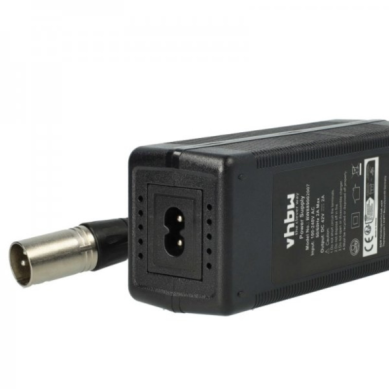 Kakovosten polnilec za električna kolesa proizvajalca VHBW z zaščito pred prepolnjenjem, nadtokovno zaščito, temperaturno zaščito in certifikati CE in RoHS. Polnilec je opremljen z LED indikatorjem, ki prikazuje status polnjenja.